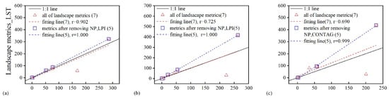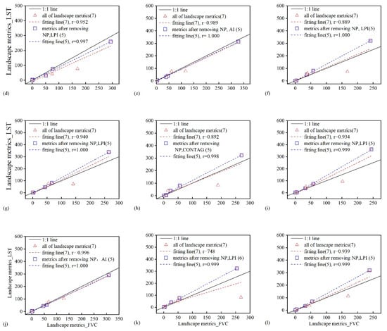 In the sample area with maximum correlation coefficient (Figure 4j), whether all seven metrics in Table 3 were used or the discrete larger metrics (NP and AI) were excluded, FVC and LST landscape pattern metrics were closely correlated (the red fitting dotted line, seven metrics; the blue fitting dotted line, five metrics), the correlation coefficients reached 0.996 and 1.000, respectively. In the sample area with minimum correlation coefficient (Figure 4c), the landscape pattern metrics of FVC and LST showed a close relation by employing the seven metrics in Table 3 with a correlation coefficient of 0.690 (the red fitting dotted line, seven metrics), and the correlation coefficient was 0.999 after excluding the larger discrete metrics NP and CONTAG (the blue fitting dotted line, five metrics).