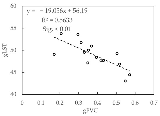 Relationship between gFVC and gLST at 23 July 2020 in field survey experiment.