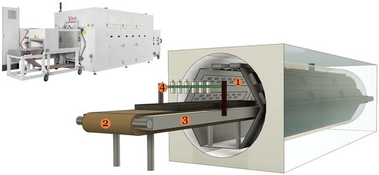 Controlled/localised heating in industrial microwave oven [,] is paramount to address hot-spot formation and thermal runaway issues []. As a consequence, system efficiency and processed product quality may improve. Presently, we are working on a type of microwave oven technology called HEPHAISTOS, as shown in Figure 1. The system is characterized by hexagonal geometry [] for the cavity that supports a very high electromagnetic field homogeneity. Its principal areas of applications are in material processing such as thermal curing of fiber composites and drying of porous foams. Specifically, during drying of a porous polymer foam, thermal runaway and hot-spot formation may occur [,]. Such situations may lead to low-quality processing and may even damage the industrial unit in case a fire is kindled in the foam. Therefore, automatic online control of power sources (magnetrons) to obtain a selective heating rate at each stage of the drying process is one option to eliminate these problems. To apply such precise control of power sources, non-invasive in situ measurement of the unknown distribution of moisture, especially dominant wet-spots, inside the material is required. The infrared temperature sensors integrated with the microwave drying systems are capable of giving information only on the surface of the material. That is not sufficient to provide efficient control of microwave sources. Thus, integration of microwave tomography (MWT) imaging modality operating in X-band range [] (from 8 GHz to 12 GHz) with the drying system is proposed (see number Tag 4 in Figure 1) to estimate the moisture content distribution in a polymer foam. Based on the MWT tomographic output, an intelligent control strategy for power sources can be derived. Preliminary work in this direction is reported in [] by the authors. Industrial process tomography based on microwave sensors for various applications are reported in [,]. The specific use-case of microwave sensor technology for moisture measurements in a sample are given in [,,,,,,]; but they are limited in providing moisture information on the surface or in a small sample size but not the volumetric information as required for our purpose.