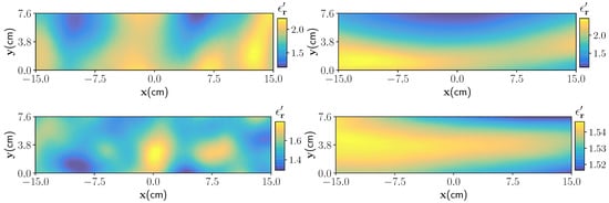 Here, and , are the characteristic length components. denotes the number of pixels. In practice, the characteristic lengths affect the moisture distribution in , and directions. To generate simulated moisture samples, the uncertainties in the dielectric characterization is also considered, and hence Equation (12) is replaced by