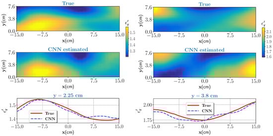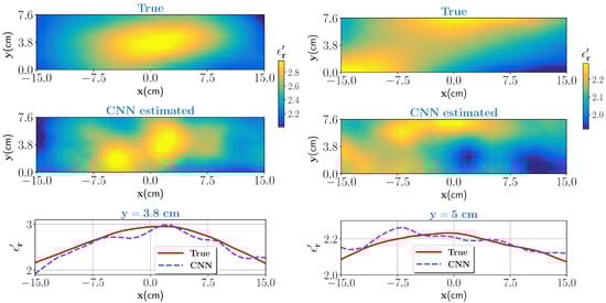 Two test samples with low (0–25%), and moderate (25–50%) wet-basis moisture contents are chosen as a first test case. As per the dielectric characterization, the real part of the dielectric constant value in the low moisture case varies approximately between 1.16 and 1.52 and for the moderate moisture case between 1.52 and 2.1. The corresponding scattered electric fields are measured and given as an input to the trained CNN. The noise level is set to , see Equation (17). The true test samples and estimated outputs from the CNN for the low moisture and for the moderate moisture are shown in Figure 5 (left column) and Figure 5 (right column), respectively. Further, to assess the closeness of the estimates, pixel values on data line cm for low moisture case and pixel values on data line for moderate moisture are visualized and shown in the bottom of Figure 5. In both cases, the CNN estimated output closely matches the ground truth. Estimation accuracy is evaluated by comparing the profile similarity index, denoted here as , which is evaluated as