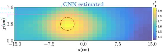 In the second example, we have considered a moisture wet-spot inside the foam. To create the wet-spot moisture target, a spherical foam of diameter 2.5 and with 43% wet-basis moisture level (−) is chosen. An approximate location of the target inside the foam is centered at . The estimated output from the CNN is shown in Figure 10. Estimated result shows that the network can satisfactorily locate the wet-spot which is placed around the bottom of the foam. The estimated real part of the dielectric constant corresponds between 37% and 39% of moisture level in the wet-spot.