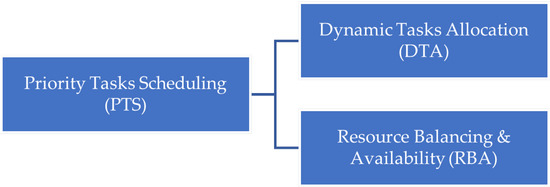 This section presents the main factors that have motivated the authors to propose dynamic scheduling. Priority task scheduling (PTS) for fog and cloud environments is also presented. This consists of dynamic task allocation (DTA) and resource balancing and availability (RBA), as shown in Figure 1. Applications of fog computing for healthcare are latency-sensitive, whereas others are delay-tolerant. The workloads created through those applications are of variable length and dynamic and need priority implementation in the cloud and edge. In the healthcare environment, applications fight for restricted resource devices. At different nodes of the fog, these workloads are executed and allocated. Using the basic Round Robin (RR) algorithm, which utilizes the First Come First Served (FCFS) method for job scheduling in fog computing, equivalent priority is provided for all tasks, in-creasing the time of response for tasks with limited burst times. However, the fog computing paradigm aims to minimize the waiting time, response time, and traffic of the network [22]. Thus, a task scheduling algorithm for the fog needs to be designed and implemented with the following goals: