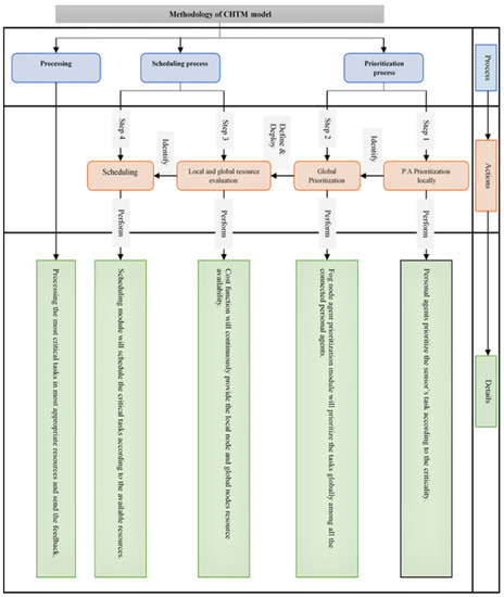 This section shows the methodology of the CHTM model. Figure 2 represents the processes, actions, and details of each step in CHTM, while it contains three main processes. Prioritization has two main parts: personal agent (PA) prioritization and global prioritization, which are achieved by the prioritization module in each fog node. The scheduling involves two main actions, local and global resource evaluation, which are performed by fog node agents (FNAs). Lastly, the most critical tasks with the most appropriate available resources are processed.