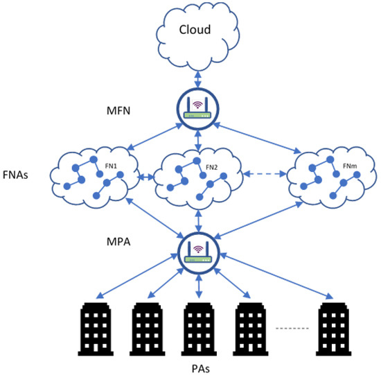 According to the proposed scheduling strategy, in this section, we present our CHTM model, which was built using MASs (multi-agent systems). An MAS represents a system of cooperating intelligent agents and autonomous entities that may communicate and behave with each other in a definite environment, based on the state of the environment [27]. In the CHTM model, as shown in Figure 3, scheduling, nodes, tasks, and system fitness are the monitoring objects. We take into account the model of the multi-agent system (MAS) with four agent types: a fog node agent (FNA), master agent (MA), personal agent (PA), and master personal agent (MPA). In the proposed model, three levels of processing are provided: PAs, FNAs, and the cloud. Furthermore, two levels of control are provided: MPAs and MFNs.
