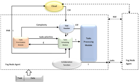 where t is the current time, priority (k, t) is the priority of task k value at time t, z is the number of tasks associated with k, and r is the priority value of task k, at instant t, given in advance by cloud–fog platform customers. The task scheduling module will decide to process the incoming tasks in the local node (in case the task’s size fits the local node resources) or forward the tasks to the neighboring nodes (in case of the unavailability of local node resources). Indeed, the task scheduling module will make a decision according to the set of features (priority, load balancing, resource availability). In other words, three main decisions are provided by this module: execute locally, execute in neighbor, and execute in the cloud. The task scheduling module obtains the cost (£) and available resources from the cost function according to the cost and the history of each patient [28]. Tasks are scheduled through patient health records (PHRs) from the cloud.