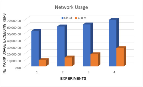 Firstly, the usage of the network was 54,069.097 kbps using the edge–cloud approach. In case1, each node had one agent to communicate with each other and one agent at MFNA, with a usage of 9127.8 kbps using the edge–fog–cloud approach for the same quantity of information. Secondly, the usage of the network was 59,213 kbps using the edge–cloud method. In case2, the usage of the network was 13,340.2 kbps using the edge–fog–cloud approach for the same amount of information. Thirdly, the network usage was 64,227.78 kbps using the edge–cloud approach. In case3, we established two agents in each fog node, in which one agent communicated with other fog node agents and MFNA, while the other agent controlled the processing of the critical tasks. The network usage was 18,013.9 kbps using the edge–fog–cloud approach for the same amount of information. Lastly, the network usage was 77,046.54 kbps using the edge–cloud method. Moreover, in case4, the network usage was 26,917.1 kbps using the edge–fog–cloud approach for the same amount of information. The overall cloud network usage was 79%. The overall CHTM model network usage was 21%. Figure 5 shows the simulation result.
