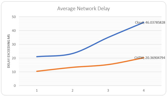For the first part of the dataset, we obtained a delay of 21.04 ms for 21 patients by using the edge–cloud method. In case1, we achieved a delay of 10.43 ms by using the edge–fog–cloud approach for the same amount of information. For the second part of the dataset, we obtained 23.33 ms for 30 patients by using the edge–cloud method. Moreover, we achieved a delay of 13.33 ms by using the edge–fog–cloud approach for the same amount of information. In the third part of the dataset, we obtained a delay of 35.08 ms for 40 patients by using the edge–cloud method. In case2, we achieved a delay of 15.34 ms using the edge–fog–cloud approach for the same amount of data. Lastly, we gained a delay of 46.03 ms for 100 patients by using the edge–cloud method. Additionally, for the same number of fog nodes used in the third run, we obtained a delay of 20.36 ms by using the edge–fog–cloud approach for the same amount of information. The overall cloud network delay was 65%. The overall CHTM model network delay was 30% in comparison with the edge–cloud method. Figure 7 shows the simulation results.