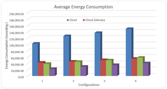Average energy usage is described, for any interval, as the infrastructure energy usage (containing whole fog nodes and cloud data centers) normalized through the environment’s extreme power. We measured the energy of the cloud, cloud gateway, fog nodes, and master fog node.
