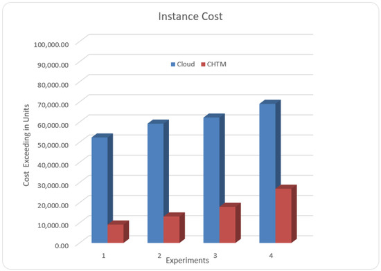 In the first run, we calculated the cost of data processing for six hospitals. The consumed cost for the edge–cloud method was 54,290.12 units. However, in the edge–fog–cloud model, we established six fog nodes for the six hospitals. The consumed cost was 23,769.33 units. In the second run, we doubled the number of hospitals—i.e., 12—and the consumed cost was 69,301 units with the edge–cloud. However, when we established 8 fog nodes for the 12 hospitals, the consumed cost was 33,140.85 units in the edge–fog–cloud method. In the third run, we used the data of 16 hospitals; we obtained only 72,216.6 units in the edge–cloud method. Moreover, when we established 10 fog nodes for the 16 hospitals, the consumed cost was 37,001.9 units for the edge–fog–cloud. In the last run, we calculated costs from the data of 20 hospitals; the consumed cost was 930,329.01 units in the edge–cloud method. We established 12 fog nodes for the 20 hospitals; the consumed cost was 46,106 units for the edge–fog–cloud model. The instance cost of the edge–cloud model in the first run of the dataset was 85%, whereas the CHTM (edge–fog–cloud) model cost was 15%. In the second run, the consumed cost of the edge–cloud model was 82%, whereas, in the CHTM model, it was 18%. In the third run, the instance cost of the edge–cloud model was 78%, whereas the CHTM was 22%. In the last run, the consumed cost of the edge–cloud model was 72%, whereas that of the CHTM model was 28%. Figure 9 represents the simulation result. The proposed model shows a promising result as compared to the other models; however, the limitation of this model is that it has been built to process ECG-critical tasks, whereas the model should be able to process different vital signs at the same time.