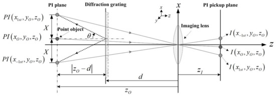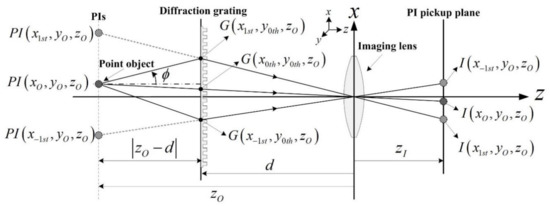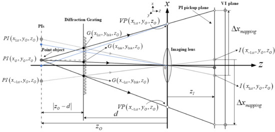 Figure 2 shows basic geometries to explain the ray analysis in diffraction grating imaging, where a point object, its parallax images, and an imaging lens are introduced [20,21,22]. Here, a point object is located at (xO, yO, zO) and a diffraction grating is located at a distance d away from an imaging lens in the x–y plane. The z-coordinates of all parallax images are the same as zO according to diffraction grating imaging. The grating order is limited in the first-order diffraction to understand the system easily without loss of generality. Let the −1st and 1st order parallax images be PI(x−1st, yO, zO) and PI(x1st, yO, zO) which are the ±1st order diffraction of the point object. Here, the point object at (xO, yO, zO) is the 0th order parallax image. The diffraction angle θ between the 1st order and the 0th order parallax images is written as θ = sin−1(mλk/a), where λk is the wavelength of the kth light source, and a is the grating pitch and m is the diffraction order such as 0, 1, or −1. The tangent of the diffraction angle provides the locations of the parallax images. Here are the x-coordinates as follows: