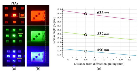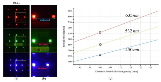 Figure 4 shows the relationship between depths and spatial periods in the parallax image arrays for multiple wavelengths utilized in the proposed diffraction grating imaging system, where the wavelengths λk of the light sources are 635 nm (red), 532 nm (green), and 450 nm (blue), respectively. The parallax image arrays of a circular object are acquired using these three light sources, as shown in Figure 4a and their enlarged versions are shown in Figure 4b. Here, the circular object is located 100 mm away from the diffraction grating. As shown in Figure 4b, the spatial period of each parallax image array for the object depth was measured as 661, 553, and 463 pixels under the red, green, and blue light sources, respectively. It is seen that the larger the wavelength of a light source, the larger the spatial period. These results match well with Equation (2).