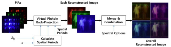 Figure 7 shows the computational reconstruction method for the proposed diffraction grating imaging system with multiple wavelengths. Here, the objects are sequentially illuminated with lasers of multiple wavelengths. The parallax image arrays of the objects are captured by our pickup process and apply to the back-projection process as input data. The back-projection based on the virtual pinhole array provides a reconstructed plane image at a given depth z for each wavelength. Here, the wavelengths λk of the light sources in use are 635 nm (red), 532 nm (green), and 450 nm (blue), thus three reconstructed images are produced in this case. Those reconstructed images from multiple wavelengths must be at the same depth, which is guaranteed by the spatial period calculation method of the graph in Figure 4c. Then, reconstructed images corresponding to their single wavelength are applied to a spectral selection method. After the integration or combination process, the final reconstructed plane image is obtained at the given depth z. Repeating this process for all depths provides a 3-D volume in diffraction grating imaging.