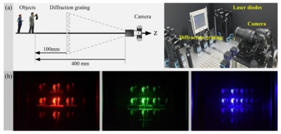 Figure 8 shows an optical experimental setup to evaluate the proposed 3-D imaging system via multiple wavelength diffraction grating imaging. As shown in Figure 8a, the experimental objects were placed 100 mm away from a diffraction grating, and the diffraction grating was located at 300 mm from a camera. The diffraction grating in use is made of two transmissive amplitude diffraction gratings with a line density of 500 lines/mm that are available commercially through perpendicularly concatenating two diffraction gratings in our laboratory. Three types of lasers with an optical power of 4.5 mW and the wavelengths of 635 nm (red), 532 nm (green), and 450 nm (blue) are utilized to illuminate the objects sequentially. Then, parallax images observed through the diffraction grating are acquired by a digital camera with a CMOS sensor of 35.9 × 24 mm and a pixel pitch of 5.95 μm to obtain parallax image arrays. The digital image size of each parallax image array is 3007 × 3007 pixels. Examples of three parallax image arrays corresponding to three types of wavelengths are shown in Figure 8b.