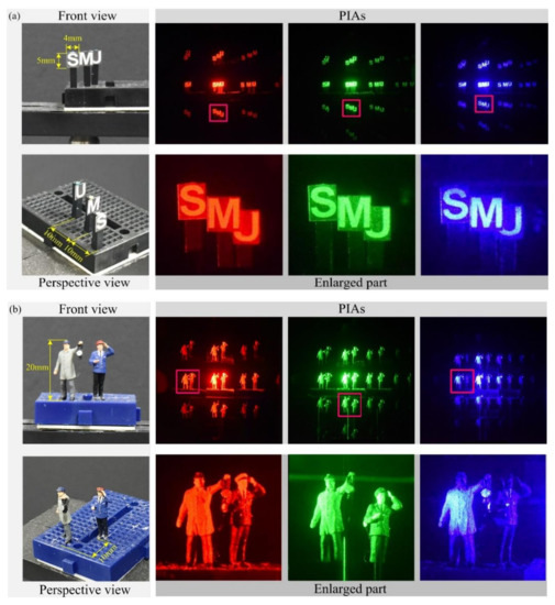 Figure 9 shows front and side views of the objects used in our optical experiments, parallax image arrays acquired by the pickup process, and their enlarged parallax images marked with a red square. As shown in Figure 9a, three flat objects of ‘S’, ‘M’, and ‘U’ were employed for optical experiments, and their positions were 100, 110, and 120 mm from the diffraction grating. In addition, as shown in Figure 9b, two human miniatures were used, and the 3-D objects are located 100 and 110 mm away from the diffraction grating. Other physical data regarding these objects are shown in the first column of Figure 9. Observing the enlarged parallax images in Figure 9, it is seen that the size of objects located at the same distance is the same regardless of the wavelengths of the light sources. On the other hand, the images from the red wavelength are rather blurred compared to those from the green and blue wavelengths. For example, as shown in Figure 9b, the buttons in the front human object are invisible at the red wavelength whereas they are visible at the green and blue wavelength. The random noises arising from the laser speckle noise are much stronger at the green and blue wavelengths. In addition, crosstalk between parallax images is seen in the parallax image from the green wavelength. The green horizontal bar in the enlarged part of the green image in Figure 9b is the crosstalk that arises from overlapping between parallax images due to the nature of diffraction grating imaging. Also, uneven intensity occurs in the enlarged part from the blue wavelength in Figure 9b. This uneven illumination is stronger as the wavelength is shorter in our experiments. Therefore, the parallax images suffer from various problems such as speckle noises, blurring, crosstalk, and uneven illumination.