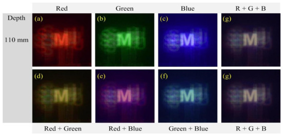 Reconstructed images for the object ‘M’ at a depth z = 110 mm. (a) Red (b) Green (c) Blue (d) Red + Green (e) Red + Blue (f) Green + Blue, and (g) Red + Green + Blue.