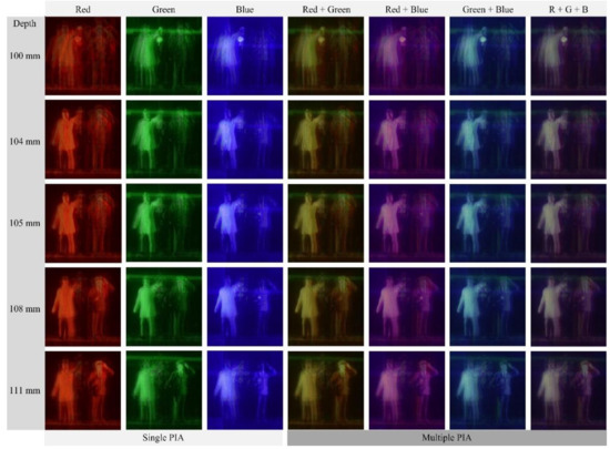3-D reconstructed images for the PIAs in Figure 9b. Each image of three columns’ left is reconstructed from a single PIA. Each image of four columns’ right is reconstructed from multiple PIAs. The row indicates the arbitrary depth of each image.