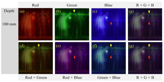 Figure 13 shows enlarged versions of the reconstructed images of a depth of 100 mm for the human object in Figure 12 to evaluate the image quality. Three images are reconstructed from single wavelengths, as shown in Figure 13a–c. Among these images, the image from the red wavelength suffers from strong blurring whereas the image from the green wavelength is much less blurred than that of the red. However, the image from the green wavelength suffers from the crosstalk, where the green horizontal bar in the image is the crosstalk from another parallax image. These unwanted artifacts exist in the image from the blue wavelength, as indicated by yellow and red arrows in Figure 13. This artifact arises from the interference or overlapping between the parallax images, which is unavoidable due to the nature of diffraction grating imaging. Such crosstalk artifact is more likely to occur as the spatial period is shorter or the illumination is stronger. For example, the image of the red wavelength unlikely occurs in the crosstalk, as shown in Figure 13a, whereas the image of the green wavelength with strong illumination can suffer from the crosstalk severely. On the other hand, in the images from multiple wavelengths, as shown in Figure 13d–g, the crosstalk is suppressed in the reconstructed images from multiple wavelengths. For example, the image from the red and blue wavelength, as shown in Figure 13c shows the best performance in terms of the crosstalk problem. Also, the crosstalk is substantially reduced in the image from three wavelengths. Therefore, the proposed diffraction grating imaging system with multiple wavelengths is more robust against the crosstalk problem than the system with a single wavelength.