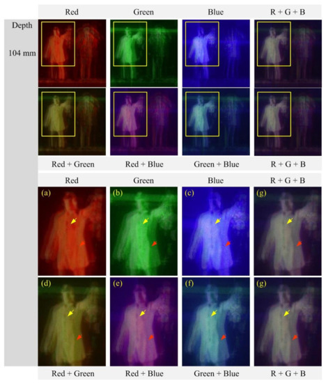 Figure 15 shows the reconstructed images at a depth of 108 mm and their enlarged portions of the areas indicated by the yellow rectangles. As shown in Figure 15a–g, the areas are well focused in all reconstructed images, thus sharp edges are visible in the areas. The selected area of the human object is homogenous, thus it is useful to compare those reconstructed images in terms of smoothness. The image from the red wavelength, as shown in Figure 15a, has a homogenous area with sharp edges. This is useful to extract a homogenous depth map. However, the images from the green and blue wavelengths suffer from impulsive noises. Also, they have shadow areas that are unwanted signals in a depth extraction method. On the other hand, the images from multiple wavelengths have sharper edges than those from single wavelengths, observing the area indicated by arrows. Especially, the image from three wavelengths has a homogenous area with less impulsive noises and shadow areas.