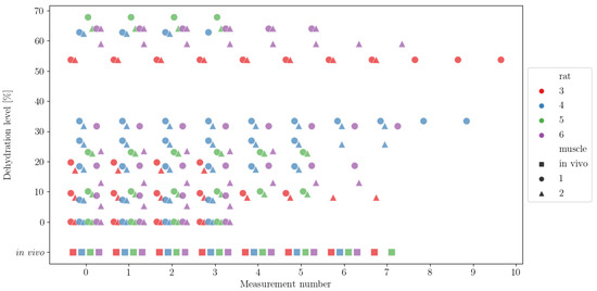 To visualise the spread of the dehydration levels and number of measurements per rat/level, we plotted the scatter plot shown in Figure 1. The dehydration level shown below 0% encodes in vivo measurements. The colour codes for the four rats are red for rat 3, blue for rat 4, green for rat 5 and purple for rat 6. In vivo muscle measurements are represented in coloured squares (there is no muscle designator for the in vivo measurements), whereas ex vivo measurements of the measured muscles 1 and 2 are represented in circles and triangles, respectively. Scatter points were plotted with an added offset to avoid their overlap. We can observe that the number of measurements went from four measurements for each rat–muscle combination of ex vivo without dehydration, up to 11 measurements for rat 3 muscle 1. The average number of measurements per rat–muscle combination was 5.8. We can further observe that the two muscles of rat 3 were measured at three dehydration levels, as were those for rat 5; the muscles for rat 4 were measured at five dehydration levels, and the muscles for rat 6 were measured at eight dehydration levels.