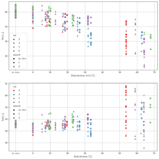 To visualise the measurements, we plotted the real and imaginary part of the εr ( and , respectively) for a set frequency as shown in Figure 2. We can observe that the data did capture the general dynamics of permittivity change for increasing dehydration levels. We can also observe that the variability in the measurements also increased with the increase in dehydration. Moreover, we can note that the inter-rat spread of the measurements was rather consistent, although there were some inconsistencies, e.g., measurements at the ~30% dehydration level were only recorded for rats 4 and 6. Finally, we can note that there were no measurements made between the levels of 40% and 50% dehydration for any of the rats. One can also infer the technical challenges behind ensuring specific dehydration levels at higher percentages, as it was not possible to measure at the same dehydration level: ~54% was the highest dehydration possible in rat 3, ~59% and 64% in rat 6, ~62% in rat 4 and ~64% and ~68% in rat 5. In addition, the measurements at higher dehydration levels varied more compared to measurements at lower dehydration levels.