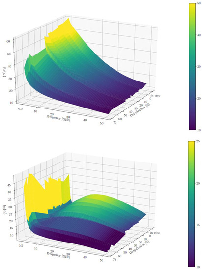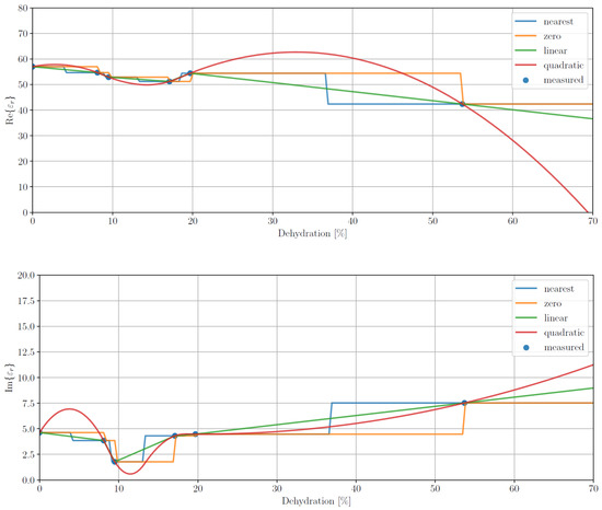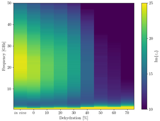 The changes in the imaginary part were more complex. Its value started high and dropped to a “valley” for low frequencies (approximately 3 GHz), which was followed by a “plateau” in the midrange of the measured frequencies (approximately 24 GHz) and a final drop for the highest measured frequencies (approximately 40 GHz). This irregularity decreased with the rise in the dehydration level, and the curve flattened for the highest dehydration levels (above 50%). We can also note that for the lowest frequencies, the imaginary part of the permittivity increased with the dehydration level.