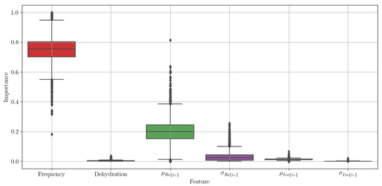 To estimate the most important features for estimating the in vivo target values, we took the best performing model—the extremely randomised trees—and repeated the nested cross-validation loop for 1000 iterations, aggregating the feature importance for each of the four models trained within one loop. Because of its stochastic nature, this process resulted with some 4000 trained models and as much feature importance values for each of the features. These are shown in the box plot in Figure 6. We can see that the two most important features are the frequency of the measured value and the mean of .