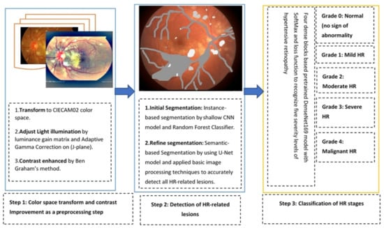 To develop this HYPER-RETINO system, we have developed several steps, which are explained in the subsequent subsections. It was noticed that the retinograph images in these datasets had different light illumination and unclear HR-related lesions. Therefore, we have performed a preprocessing step developed in this paper to enhance the HR-related lesions with light and contrast adjustment in a perceptual-oriented color space. After the pre-processing step, the HR-related lesions are detected from each image through a combination of semantic and instance segmentation techniques, and then these HR-related regions are classified by a pretrain DenseNet architecture. Those steps are explained in the subsequent subsections and visually represented in Figure 2.