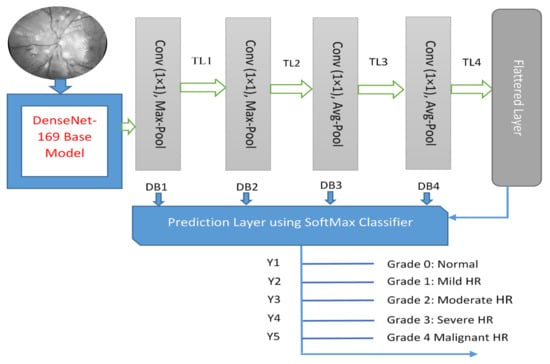 DenseNet169 is chosen as one of the best models in terms of accuracy and F1-score. Transfer learning is an efficient way [52,53] to achieve accurate results in classification problems using a small dataset. Those transfer learning (TL) algorithms are successfully applied to recognize the severity level of diabetic retinopathy (DR). Accordingly, we have been inspired by the past results based on the DenseNet169 model as a pretrain TL architecture to recognize five stages of HR. Hyper-tuning deep transfer learning models (DTL) can also boost performance. A DTL model based on DenseNet169 is proposed in this paper. A visual architecture of DenseNet is displayed in Figure 5. The proposed models used their learned weights on the ImageNet dataset, as well as a convolutional network’s structure, to extract features. Direct connections from all preceding layers to all subsequent layers are added to boost communication in the DenseNet169 model.