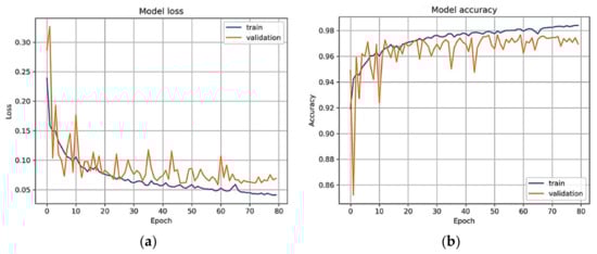 Training and validation dataset used to calculate the loss and accuracy of the final DenseNet model. The model received the retinograph as an input and is trained until there is convergence on the augmented dataset. (a) Model loss; (b) model accuracy.