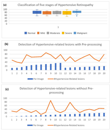 Firstly, an experiment is conducted to check the performance of the pre-processing step to enhance the contrast in a perceptual-oriented color space. The pre-processing method is implemented with the HYPER-RETINO system to obtain the higher classification and detection result of the fundus image. The preprocessing methods are obtained before inputting the retinograph images into the HYPER-RETINO to assess the precision and robustness of the HYPER-RETINO procedure. In fact, the pre-processing step results in the reduced overall complexity of the network model. The pre-processing methods of the retinograph images are composed of color space transform, light adjustment and enhanced contrast. After the pre-processing of the retinograph images, the distinct feature set is obtained by semantic and instance-based segmentation techniques. The detection of HR-related features is visually displayed in Figure 7. This figure clearly displays that the HR-related features are accurately detected. Without using pre-processing step and color space transform, the detection accuracy of the five stages of hypertensive retinopathy is significantly decreased as shown in Figure 8b,c.