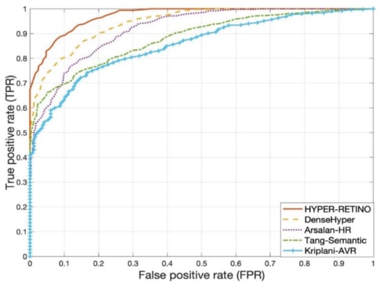 Visual representation of State-of-the-art comparisons of the HYPER-RETINO system in terms of the AUC curve five stages of HR from 2800 HR images with a preprocessing step.