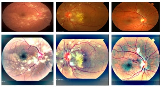 where, the function is the luminance intensity of a pixel at (α, β) coordinates and is the luminosity enhanced image. At this point, the Adaptive Gamma Correction (AGC) technique is used to boost the brightness of a given image. The cumulative distribution function of the normalized histogram of the input fundus image is used to calculate the weight for the gamma correction method in this method. The brightness boost leads to a partial contrast improvement. However, in cases of low-contrast fundus images, a contrast enrichment technique is required to improve the image. Ben Graham’s method [47] is utilized then to finally improve the contrast of the retinograph images. Afterward, the J* plane of Jch color is combined, and then inverse transform is applied to reconstruct and visualize the enhanced image, as shown in Figure 3. This figure shows the results of the color contrast enhancement process. The results show a significant enhancement for the input fundus images, the first row in Figure 3, compared to the enhanced fundus images, the last row in Figure 3. This figure shows the visual example of light adjustment and contrast enhancement in JCh perceptual-oriented color space to enhance the retinograph images.