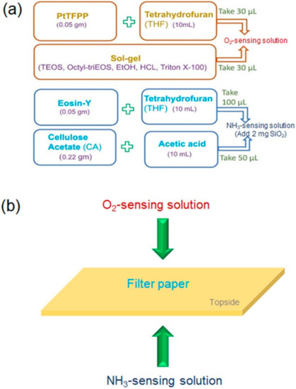 The flowchart in Figure 1a schematically shows the procedures to synthesize oxygen- and ammonia- sensing solutions. 0.05 g of PtTFPP (oxygen-sensing material [30]) was dissolved in 10 mL of THF to form a dye solution. Thirty μL of this solution was mixed with 30 μL of a sol-gel matrix. This mixture was stirred magnetically for 10 min to create an oxygen-sensing solution. The matrix was prepared as follows: we mixed 4 mL of TEOS and 0.4 mL of Octyl-triEOS to form a precursor solution. After that, EtOH (1.25 mL) and then HCl (0.4 mL) were added to the solution. The mixture was capped and stirred magnetically at room temperature for 1 h, during which Triton-X-100 (0.2 mL) was added to the mixture. Finally, the sol-gel matrix was created. 0.05 g of eosin-Y (the ammonia sensing material [31]) was dissolved in 10 mL of THF to form a dye solution. One hundred μL of the dye solution was mixed with 50 μL of another matrix mixture and 2 mg of SiO2 nanoparticles. This mixture was stirred magnetically for 10 min to create an ammonia-sensing solution. The matrix was created by dissolving 0.22 g of CA powder in 10 mL acetic acid and stirred magnetically at 40 °C for 1.5–2 h to form a transparent solution.