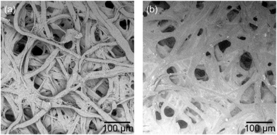 Topside SEM images of a piece of filter (a) before and (b) after treated with sensing solutions. The treatment process is schematically represented in Figure 1.
