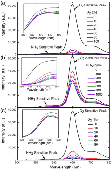 Systematic study of the emission spectra of a trial dual sensor under (a) 0 ppm of NH3, (b) 0% of O2 and (c) 200 ppm of NH3. The insets show the enlarged areas for NH3-sensitive peaks in the corresponding spectra. The intensity units for the insets are arbitrary units.