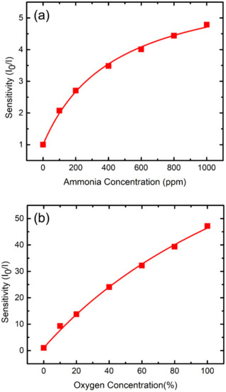 Prior to studying the cross-sensitivity effect, we need to understand how sensing peaks change with single gas species. Such study is relatively simple and can provide crucial information for the exploration of complicated cross-sensitivity effects. Figure 4a (O2 only) and 4b (NH3 only) shows the emission spectra for such a study. Gaussian fitting was used for the spectra in Figure 4b to obtain fitted NH3-sensitive peaks for different ammonia concentrations while those in Figure 4a were used to acquire fitted O2-sensitive peaks for distinct oxygen concentrations. In addition, the fitted peaks were employed to calculate the detection sensitivity of the corresponding gas species (refer to Section 3.1). Figure 6a shows the plot of the sensitivity as a function of the ammonia concentration in an oxygen-free (NH3 only) environment. The increasing trend of the plot quantitatively indicates the ability of fluorescence quenching caused by ammonia. The maximum detection sensitivity is 4.8 for a NH3 concentration of 1000 ppm. A similar increasing trend was also observed in the O2-only case, as shown in the plot of the sensitivity as a function of the oxygen concentration in an ammonia-free environment (Figure 6b). The maximum detection sensitivity is 47 for an O2 concentration of 100%.