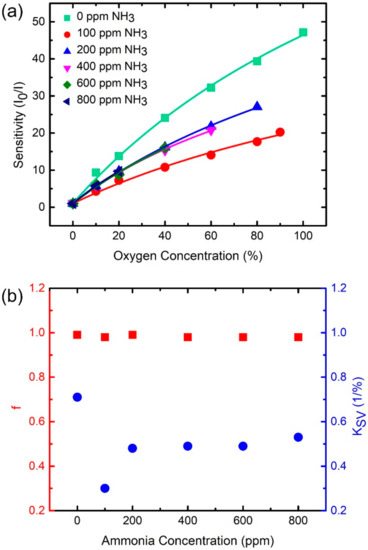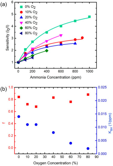 Mixtures of two gases, i.e., oxygen and ammonia, were used in this study (the influence of nitrogen is considered negligible). To explore the cross-sensitivity effect, we measured emission spectra from the trial sensor under systematically varied concentrations of O2 and NH3. The spectra were then analyzed by a method similar to that described in Section 3.4 to acquire the corresponding sensitivity, f, and KSV values. Figure 7a shows the plot of sensitivity of the fitted NH3-sensitive peak as a function of ammonia concentration under different oxygen environments. The sensitivity varies with different oxygen environments for a fixed ammonia concentration. The relation between sensitivities and ammonia concentrations fits Equation (2), no matter under which oxygen environment, as shown by the colored curves in Figure 7a. Figure 7b shows values of f and KSV as functions of the O2 concentration based on the fitting curves in Figure 7a. The parameter f has an average value of 0.79 and standard deviation of 0.07, which implies f fluctuates within ~±10%. In addition, no clear correlation between f and oxygen concentration is observed in Figure 7b (red squares). Therefore, we infer that environmental oxygen gas does not significantly change the amount of sensitive dye molecules for NH3 sensing. Unlike f, KSV monotonically decreases with increasing oxygen concentration, as shown by the blue dots in Figure 7b. Thus, the coupling between NH3 molecules and ammonia-sensing dyes is reduced by environmental oxygen gas. The higher oxygen concentration leads to a lower coupling. The maximum KSV (0.014 ppm−1 at 0% O2) is seven times the minimum one (0.002 ppm−1 at 80% O2), as shown by the blue dots in Figure 7b. Such a large variation of KSV implies that the coupling can be strongly modified by background oxygen. As a result, we speculate that oxygen-induced coupling reduction is the main reason causing the sensitivity changes observed in different oxygen environments for a fixed ammonia concentration, as shown in Figure 7a.