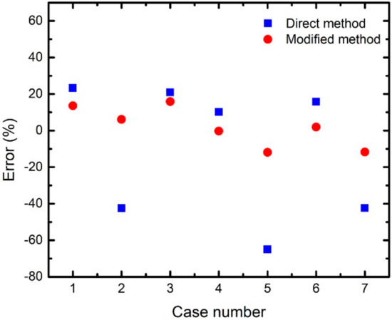 Estimated O2-concentration error as a function of case number for the direct (blue squares) and modified (red dots) methods. The experimental conditions of the various cases are presented in Table 1.