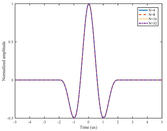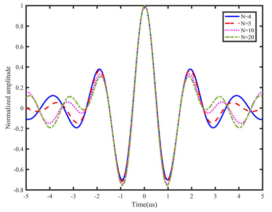 The main lobe width and side lobe level of autocorrelation curves are employed as the criteria for choosing the number of periods [4,20]. With different numbers of cycles, the autocorrelation curves of 300~700 kHz L-Chip signals are shown in Figure 3. It can be easily observed that the number of cycles does not influence the main lobe width; moreover, it only slightly influences the side lobe level. Therefore, using L-Chirp signals with different numbers of cycles creates the same effects. To avoid overlapping the directly received signal with the boundary reflection signal, and to increase the calculation speed, four-cycle L-Chirp signals are used as excitation signals in this paper.