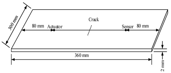 The fundamental concept behind crack detection is that the features of Lamb waves, such as energy and waveform, will be altered by cracks in their path. Ihn and Chang [10,11] used a piezoelectric sensor and actuator network to generate and receive signals, respectively. Various cracks were diagnosed by comparing the energy of the damaged signal with that of the undamaged signal. Lu et al. [3] investigated the variation of reflection and transmission of Lamb wave energy under different crack lengths and angles through finite element simulation. Experiments were carried out to verify the correctness of the finite element simulation, and Hilbert transform was used to obtain Lamb wave energy. Liu et al. [12] used continuous wavelet transform (CWT) to extract features called energy ratio changes. On this basis, an optimized sensing network was studied, and an intelligent diagnosis system of structural cracks was built. Dao [13] proposed a structural crack detection method using cointegration and fractal signal processing to remove undesired disturbance variables such as temperature variations. Crack-sensitive features were isolated, and damage was effectively detected. Wang [14] developed a synthetic time-reversal method to overcome the limitation of the conventional phased array method under a pulse-echo model, and provided an efficient imaging method for crack detection and evaluation.