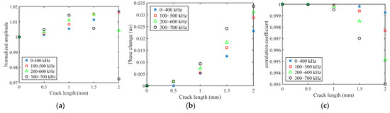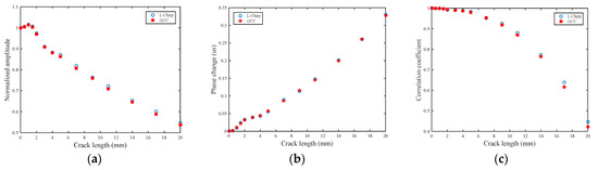 Crack length versus damage features of L-Chirp signals: (a) normalized amplitude; (b) phase change; (c) correlation coefficient.