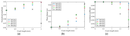 Crack length versus damage features of GCC signals: (a) normalized amplitude; (b) phase change; (c) correlation coefficient.