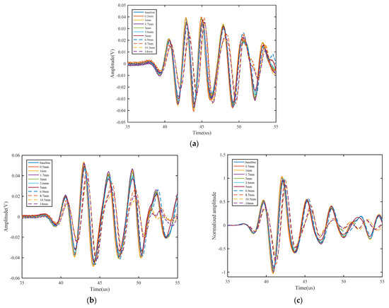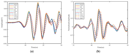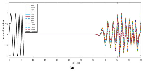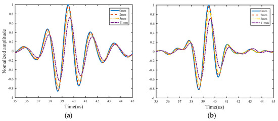 It is known that the S0 mode of a Lamb wave is more sensitive to cracks than A0 mode [30]. Taking the advantage of faster group velocity, the first received S0 mode can be easily distinguished. As mentioned earlier, the dispersive nature of Lamb waves makes it difficult to extract features of fatigue crack damage, and reduces the resolution. The dispersion compensation is applied to eliminate the effect of dispersion in the numerical simulation. Meanwhile, the pulse compression technique is used to improve the resolution, and make the processed waveform change more obvious in the damaged structure. In this paper, the S0 direct wave packets after pulse compression in these responses are extracted for analysis.