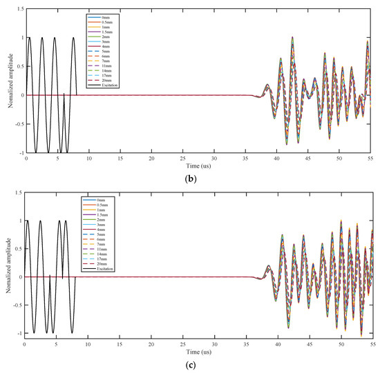 Compared with Hanning-windowed tone burst signals, the more complex waveforms and wider frequency range cause significant difficulties in analyzing the high-resolution Lamb wave propagation. The finite element (FE) simulation is widely used to analyze the damage detection process based on Lamb waves. The high-resolution Lamb wave responses of crack damages are simulated to realize and verify the proposed approach. The simulation model is same the model in Section 2 as shown in Figure 5. In this paper, a 0~300 kHz L-Chirp signal, a 150 kHz GCC signal, a 300~700 kHz L-Chirp signal, and a 500 kHz GCC signal are used as excitations. The length of the crack is set from 0 mm to 20 mm. FE simulation results of different excitation waveforms are obtained, and shown in Figure 8. The data from the plate without any crack and the data with different crack sizes are presented for comparison purposes. It is observed that the time duration of the output signals much larger than that of the excitation, which increases the difficulties of signal interpretation. This phenomenon is more obvious in L-Chirp, due to the larger frequency range. The pulse compression method is designed and used for resolution enhancement in the following: