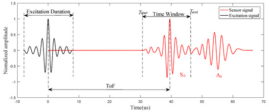 Existing literatures focus on excitation waveforms design to achieve a better -like autocorrelation; only the performance of these excitation waveforms is verified on the non-damaged plate structure [4]. Nevertheless, the accuracy and efficiency of crack determination is determined by parameters such as the number of periods, and frequency range. When the time duration of a wave is longer, the time resolution is lower. Therefore, there is always a trade-off between a good dispersion characteristic and time resolution. Based on the dispersion characteristics of guided waves propagated in a thin plate, the sensitivity to structural flaws depends on the frequency range [23]. Therefore, the parameter optimization research of high-resolution waveforms for crack detection is studied in this paper.