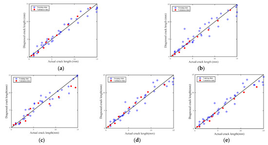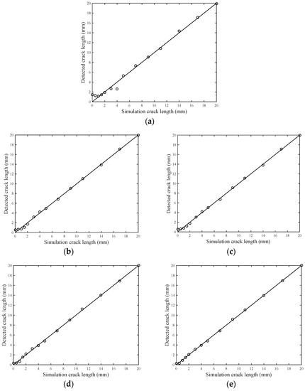 Diagnosed crack lengths with (a) 300–700 kHz L-Chip excitation signal; (b) 500 kHz GCC excitation signal; (c) 3.5 cycle 160 kHz Hanning-windowed tone burst signal; (d) 0–300 kHz L-Chirp excitation signal; and (e) 150 kHz GCC excitation signal.