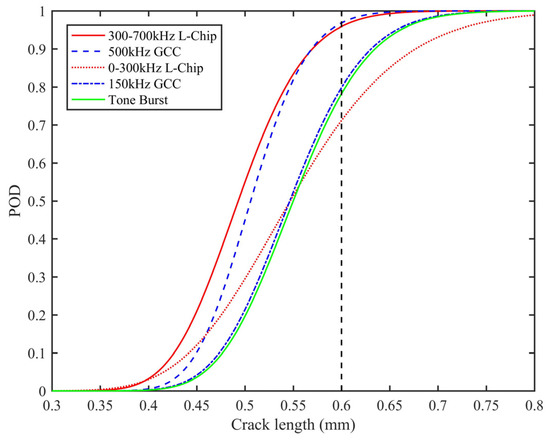 To further examine the detection reliability of the high-resolution excitation waveforms, the data of the detected crack length and the actual crack length are used to achieve POD results. The average error is preferred for quantitative crack length calculation, while POD is more appropriate for small crack detection. The minimum detectable size is set to 0.6 mm in the POD model. Figure 14 shows the POD curves associated with the five excitation waveforms. When the crack size is less than 0.6 mm, 300~700 kHz L-chirp and 500 kHz GCC perform better than other waveforms. Accordingly, these excitation waveforms have a greater capacity to identify the initial crack, benefiting from the optimal design of the excitation waveform, the dispersion compensation and pulse compression techniques, and a higher selectable frequency range. When the crack length exceeds 0.8 mm, PODs of the five excitation waveforms are approximately equal to 100%. In contrast, although 0~300 kHz L-Chirp and 150 kHz GCC have a smaller average error than the Hanning-windowed tone burst, their POD performance does not outperform the tone burst waveforms. To summarize the above, 300~700 kHz L-chirp and 500 kHz GCC yield the best detection performance among all excitation waveforms, and are used as excitation waveforms in a later experiment.