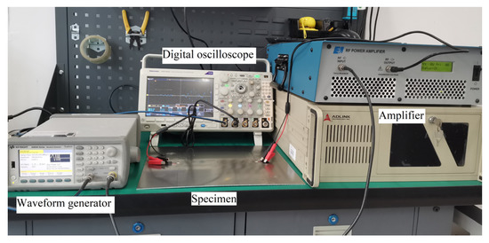 The specimen is made of 2024 aluminum. The geometry, sensor layout, and mechanical properties of the specimen are the same as those of the simulation model in Section 3, which are shown in Figure 5 and Table 1. A through-thickness center crack whose width is 0.5 mm is prefabricated through electric discharge machining (EDM). Firstly, Lamb wave signals received from five intact specimens T0~T4 are obtained as the perfect state without damage. Then, the center crack is introduced by EDM from 0.5 mm to 15 mm, and the actual crack length is read by microscopy. The high-resolution excitation waveforms are generated by a KEYSIGHT 33600A series waveform generator. The excitation waveform was amplified 30 dB before it was sent to the specimens. A Tektronix MOD3024 multichannel digital oscilloscope is used for data collection. The experimental setup is shown in Figure 15.