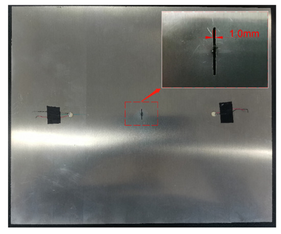 For structural health monitoring in an aluminum alloy plate, the crack damage is generally considered as a notch or an open crack where there is no contact between two cracked surfaces [9,15,32,33]. In this study, Lamb wave testing is performed on plates with artificial cracks or simulation cracks of different sizes to characterize a through-thickness crack under tensile load. Thus, the depth of the crack is a constant equal to the thickness of the plate, measuring 2 mm. Moreover, it is of great significance to consider the influence of crack depth in composite laminates structures [34,35]. In experimental validation, a through-thickness crack is introduced through electric discharge machining (EDM), with a 0.5 mm initial width in the middle of the plate. Because each EDM process should expand the width of crack, the width of crack increased to 1 mm when the length of crack measured 15 mm, as shown in Figure 16. In this way, the influence of crack width is introduced in the crack detection model.
